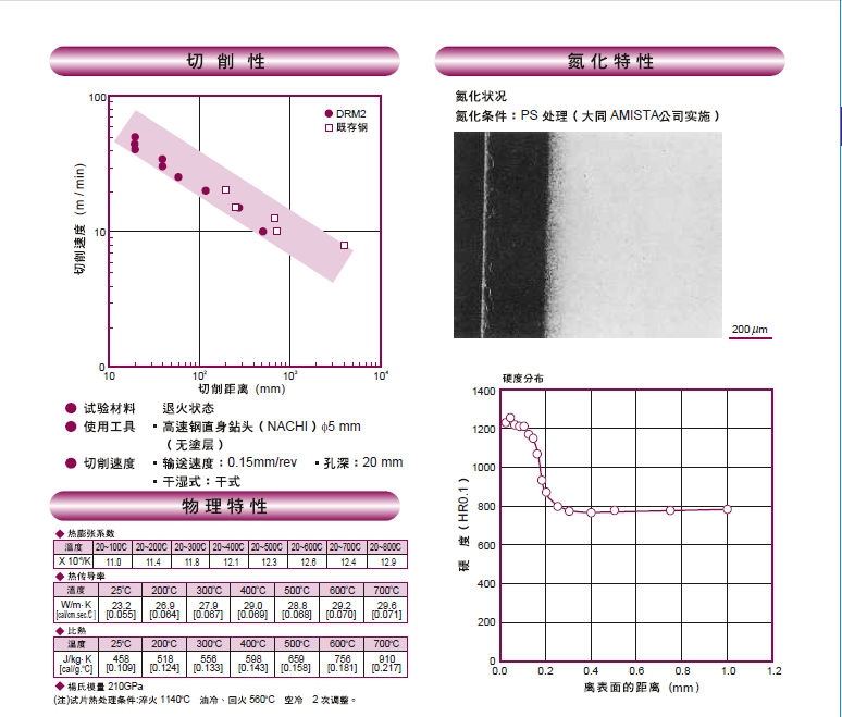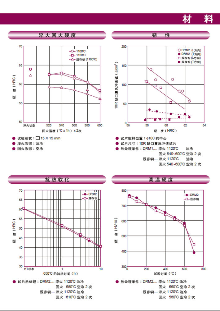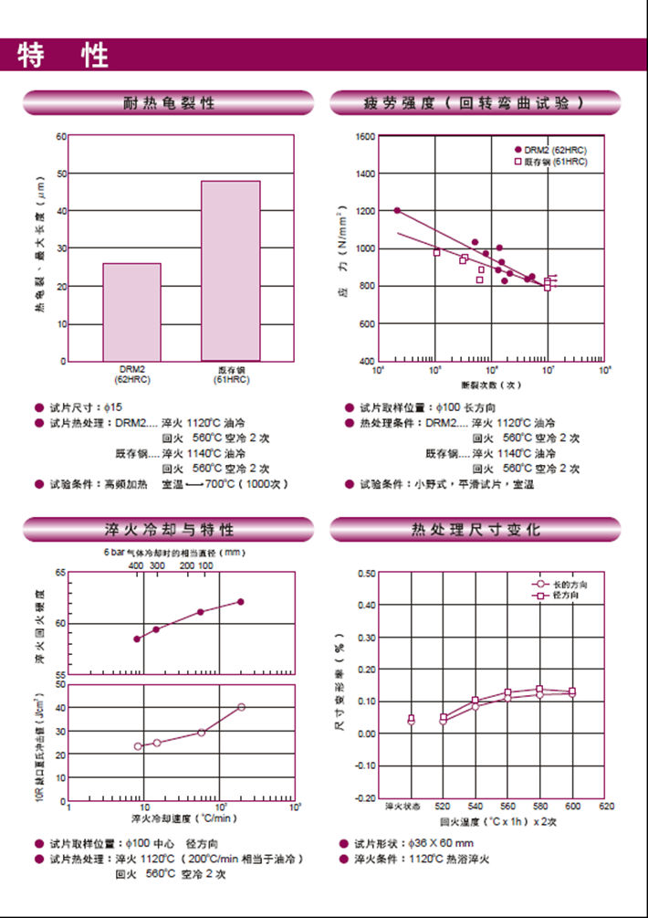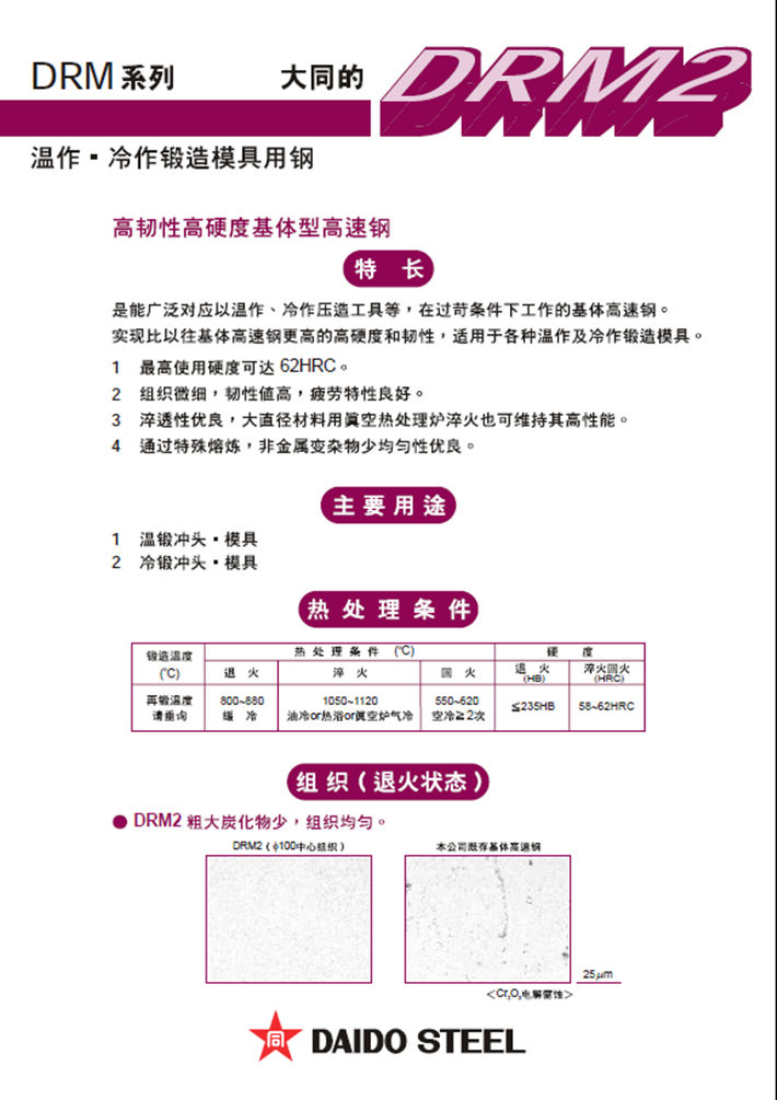 日本大同DRM2高速钢:高硬度高韧性,主要用于温作锻造。